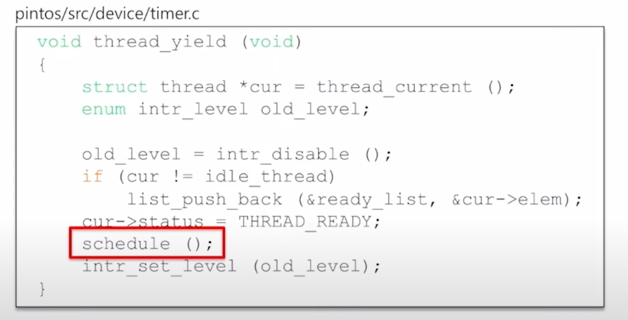 현재 쓰레드를 ready_list의 맨 뒤에 추가 (= 현재 쓰레드를 준비 상태로 전환)