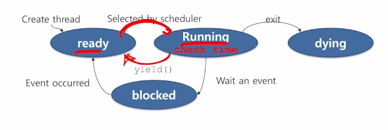 현재 CPU 사용 중인 쓰레드를 양보하고 다른 쓰레드에게 CPU 양보