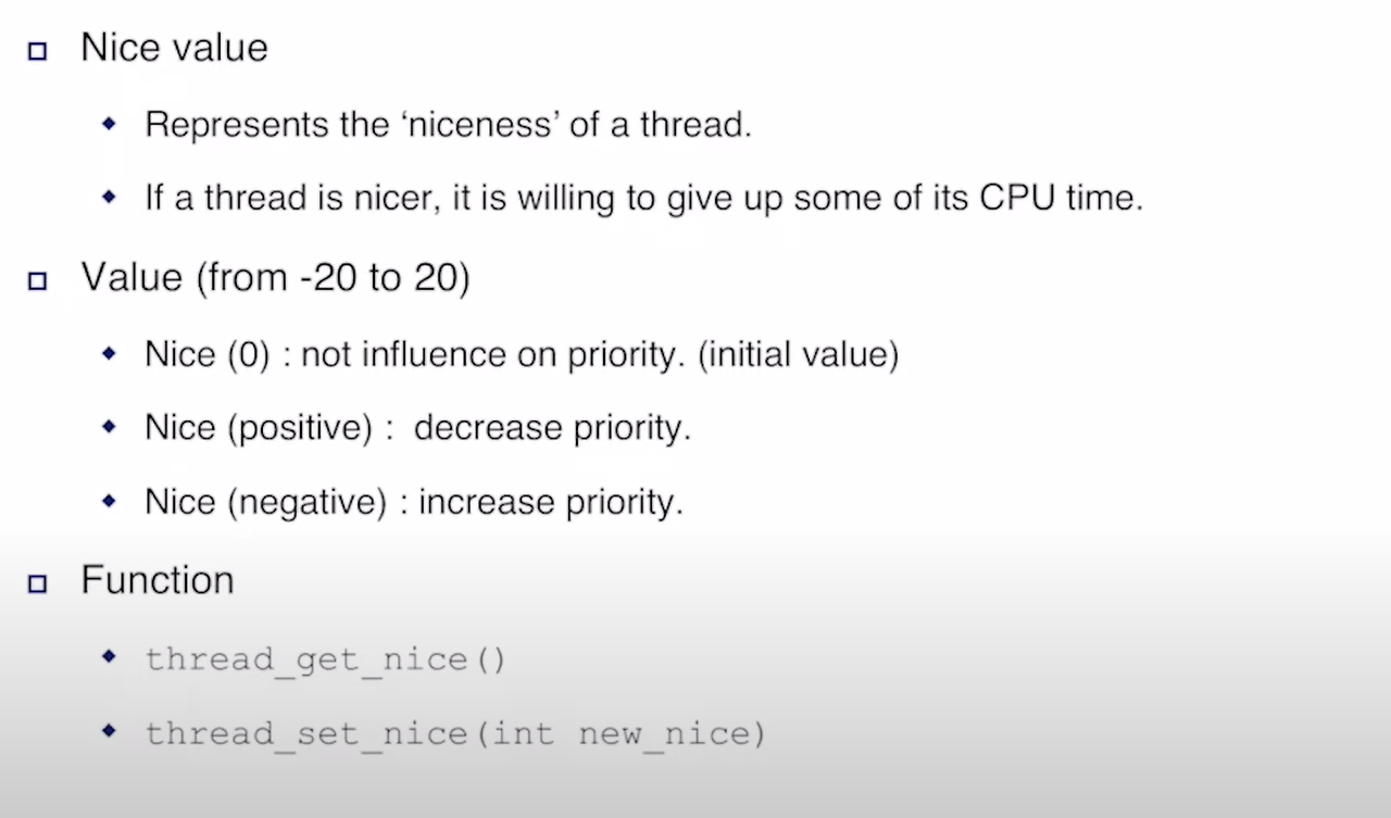 - 관련된 Function : thread_get_nice() / thread_set_nice(int new_nice)