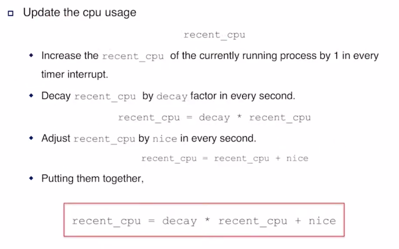 ==> 매 초마다 recent_cpu = decay * recent_cpu + nice