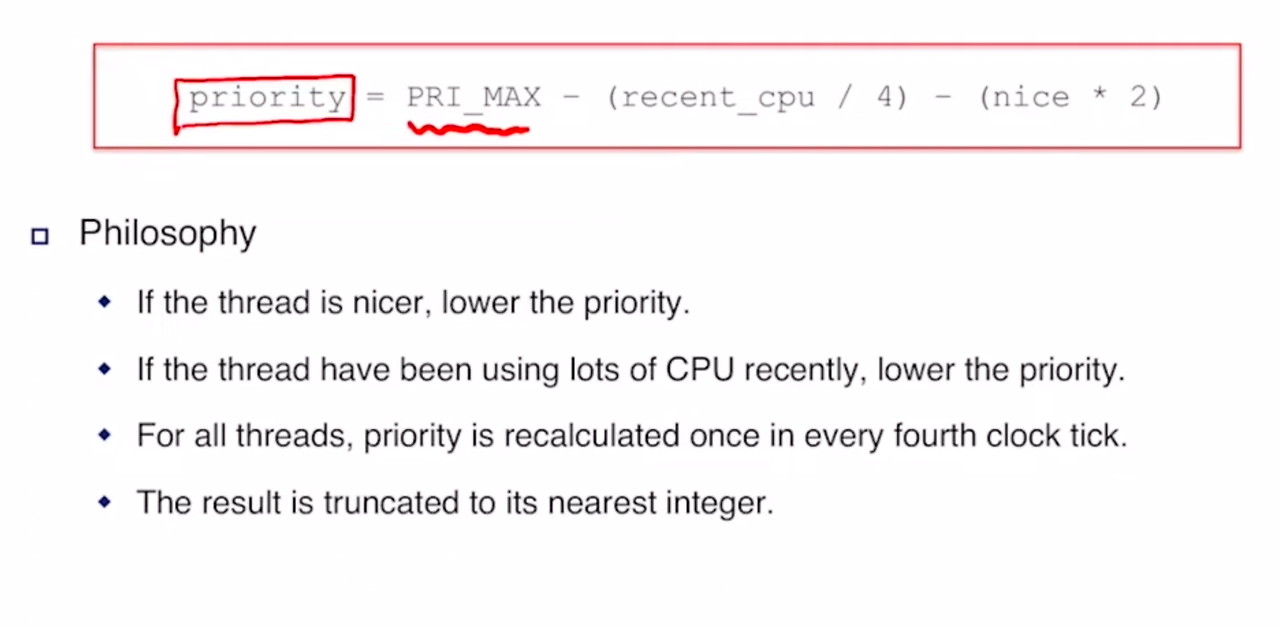 - recent_cpu, decay : CPU 사용량이 적은 I/O 동작 쓰레드의 우선순위를 높게 유지하는 데 도움