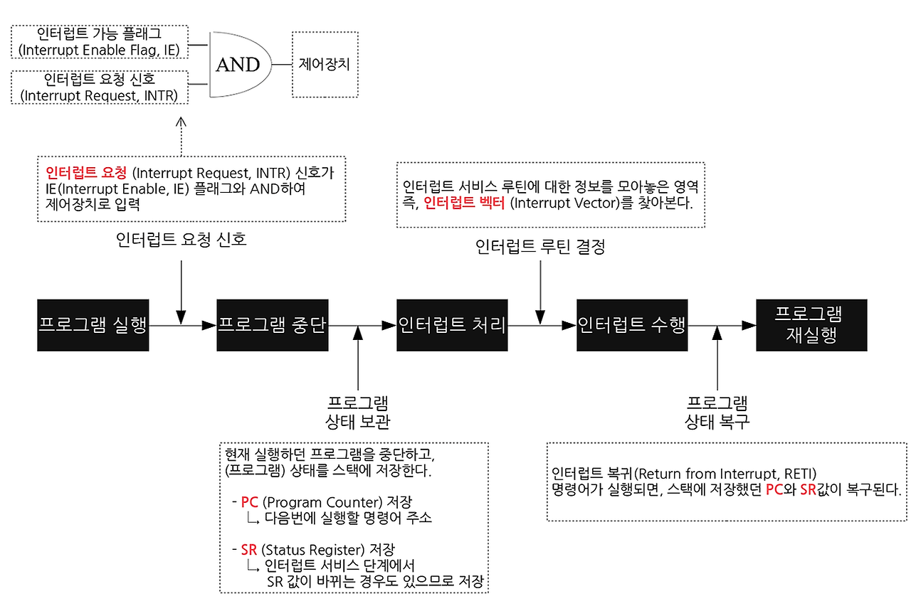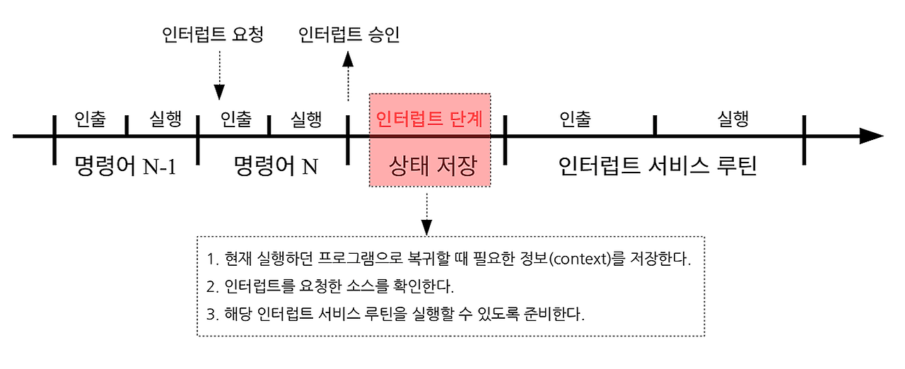 - Interrupt 발생 시 Processor는 현재 실행 중인 Instruction의 주소를 저장함
