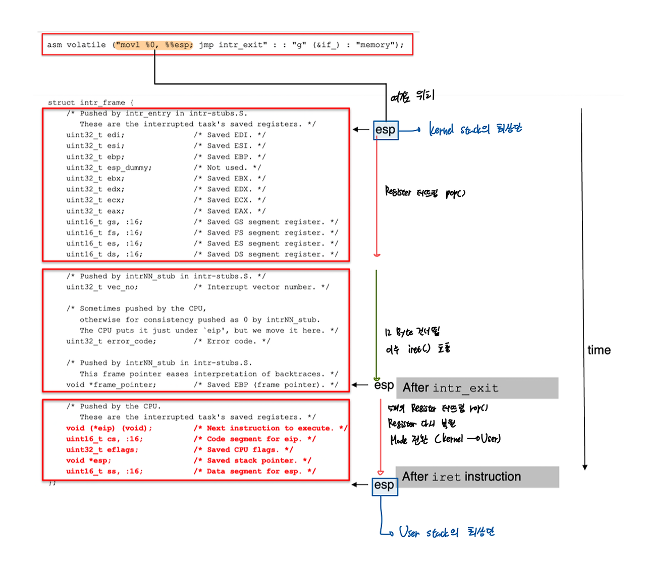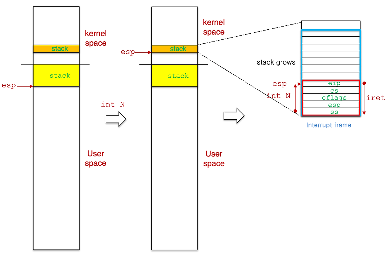 - 이 때 ESP는 user stack의 상단을 가리키다가, kernel stack 상단을 가리킴