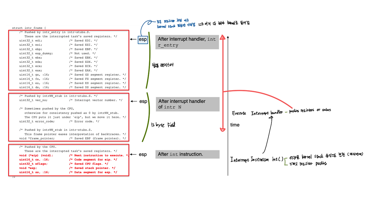 - 모든 pushing이 끝나면, ESP는 kernel stack 최상단을 가리키게 됨