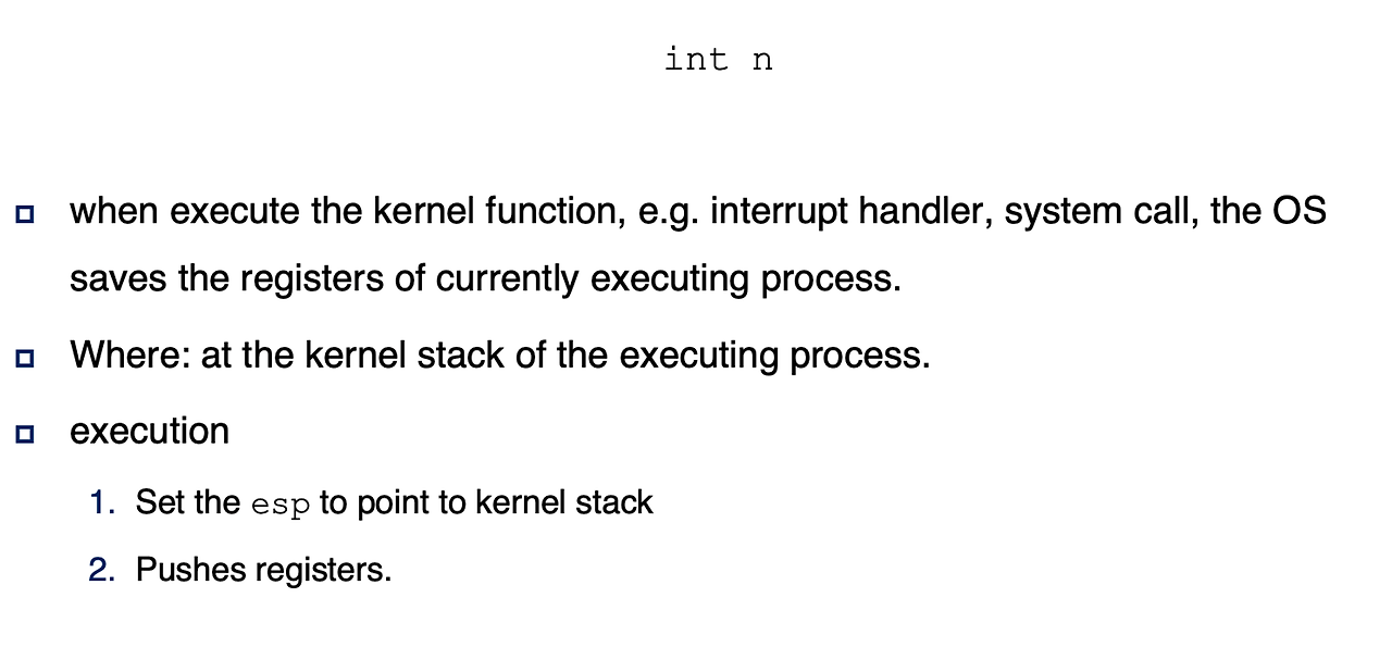 - interrupt Instruction (int()와 같은)을 호출하면, ESP는 자동으로 kernel stack 최상단 가리킴