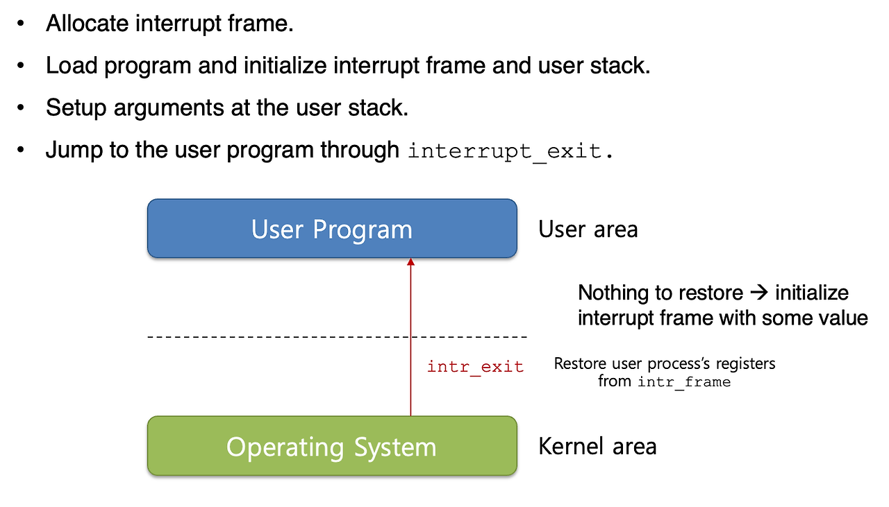 - 프로그램을 load하고, interrupt frame과 user stack을 초기화함