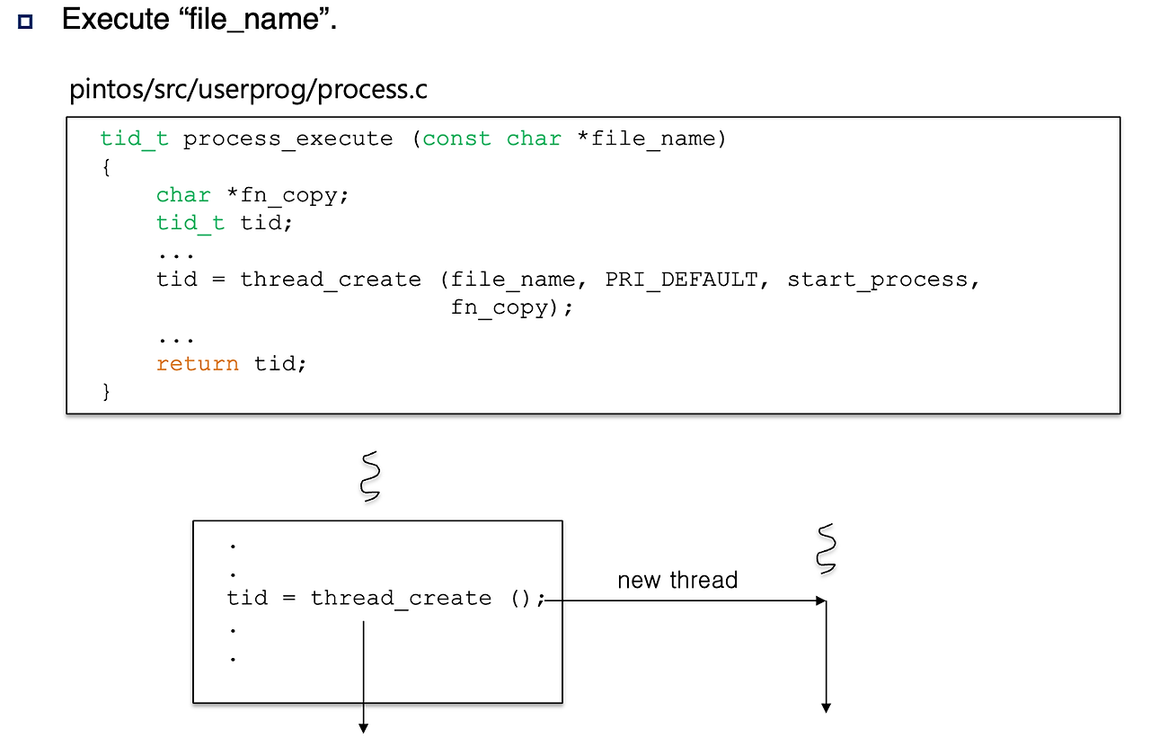 - process_execute() 함수에는 '실행할 파일 이름'을 받아와야 함