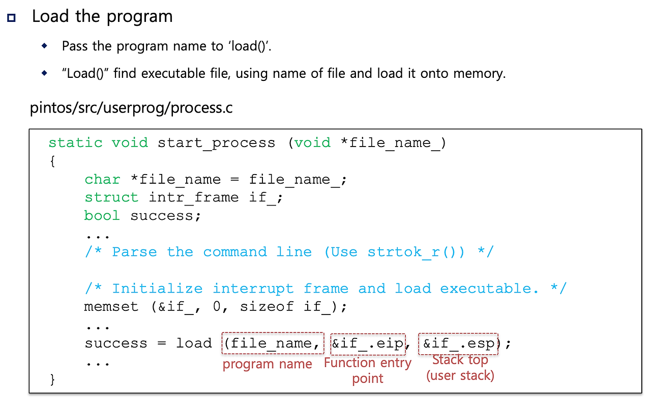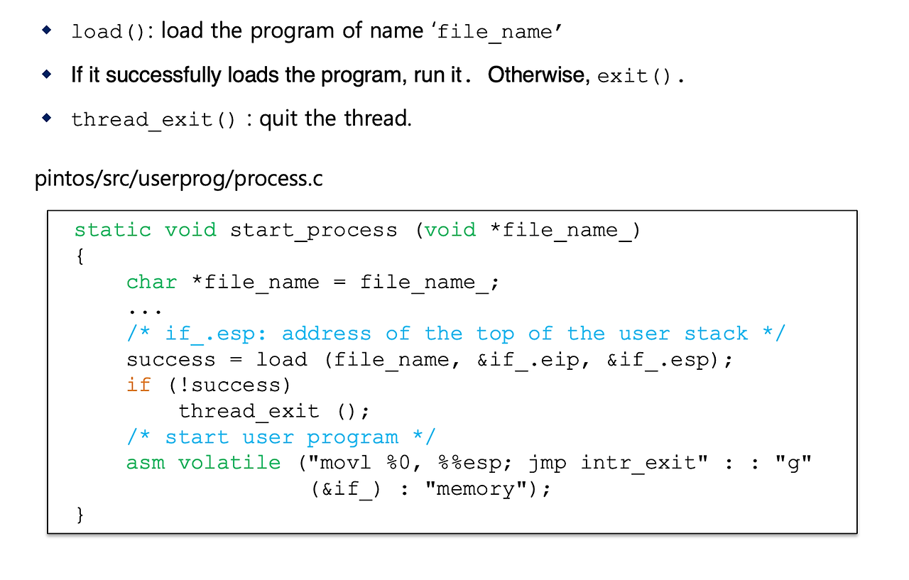 - start_process는 load() 함수에 '프로그램 이름' 전달함