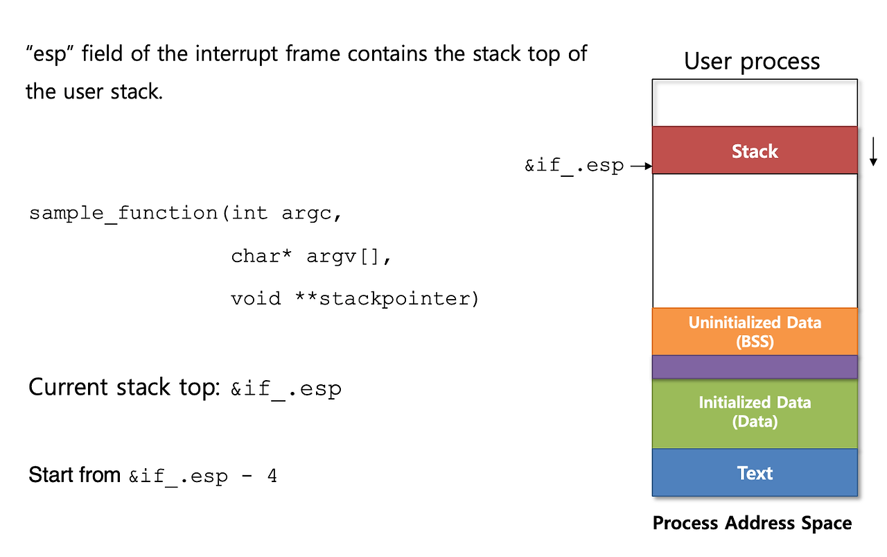 - 현재 pintOS에는 [user stack 초기화] + [user stack에 arguments 설정] 동작이 결여됨