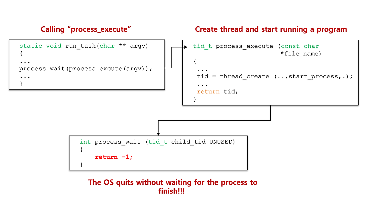 - 하지만 process_wait의 skeleton code에는 단순히 return만 기입되어 있음