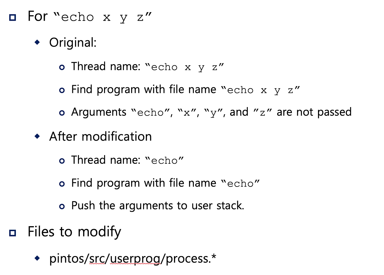 - 기존 pintOS에서는 commandline arguments를 토큰화 하는 메커니즘이 결여되어 있음