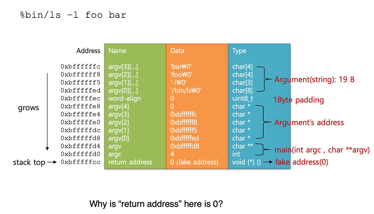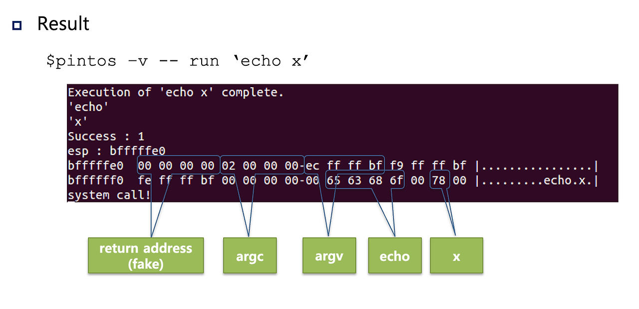 - 전달받은 문자열을 파싱해서, 새로 생성된 process의 User stack에 Pushing