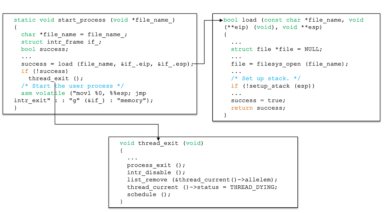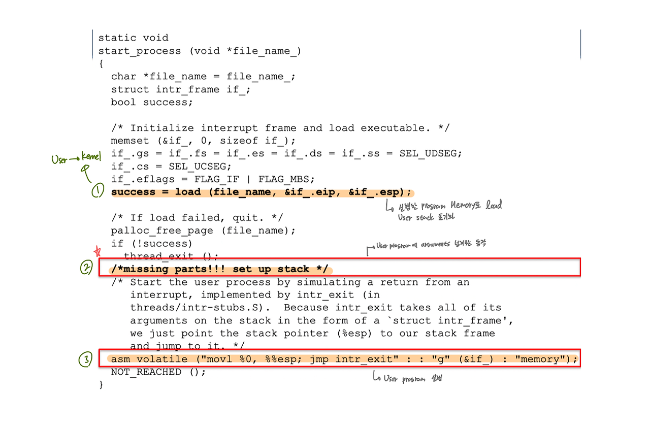 - tid_t process_execute() / static void start_process() 수정해야 함
