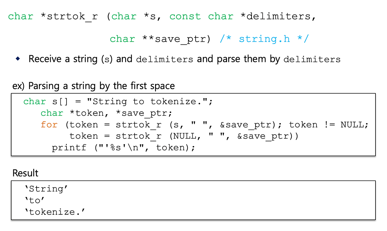 - C library 함수인 *strtok_r() 함수를 이용해서 command line을 토큰화 할 수 있음