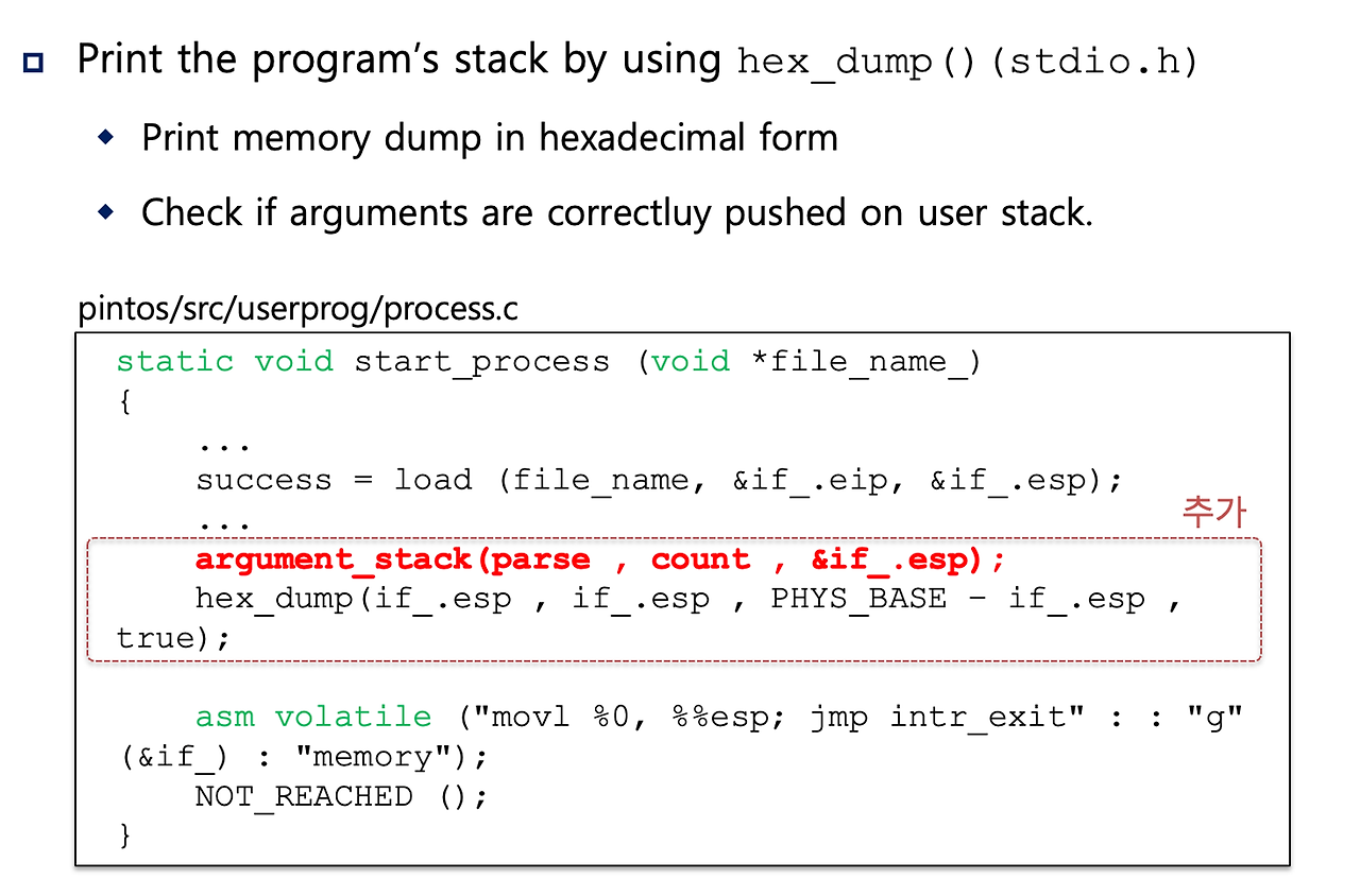 - 스택 설정이 제대로 이루어졌는지 체크하려면, hex_dump() 함수 호출하면 됨