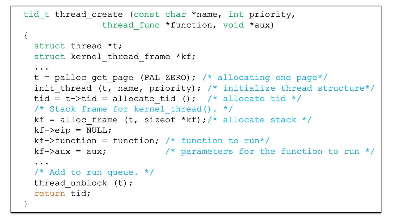 - thread_create() 함수는 2개의 중요한 동작으로 구분할 수 있음